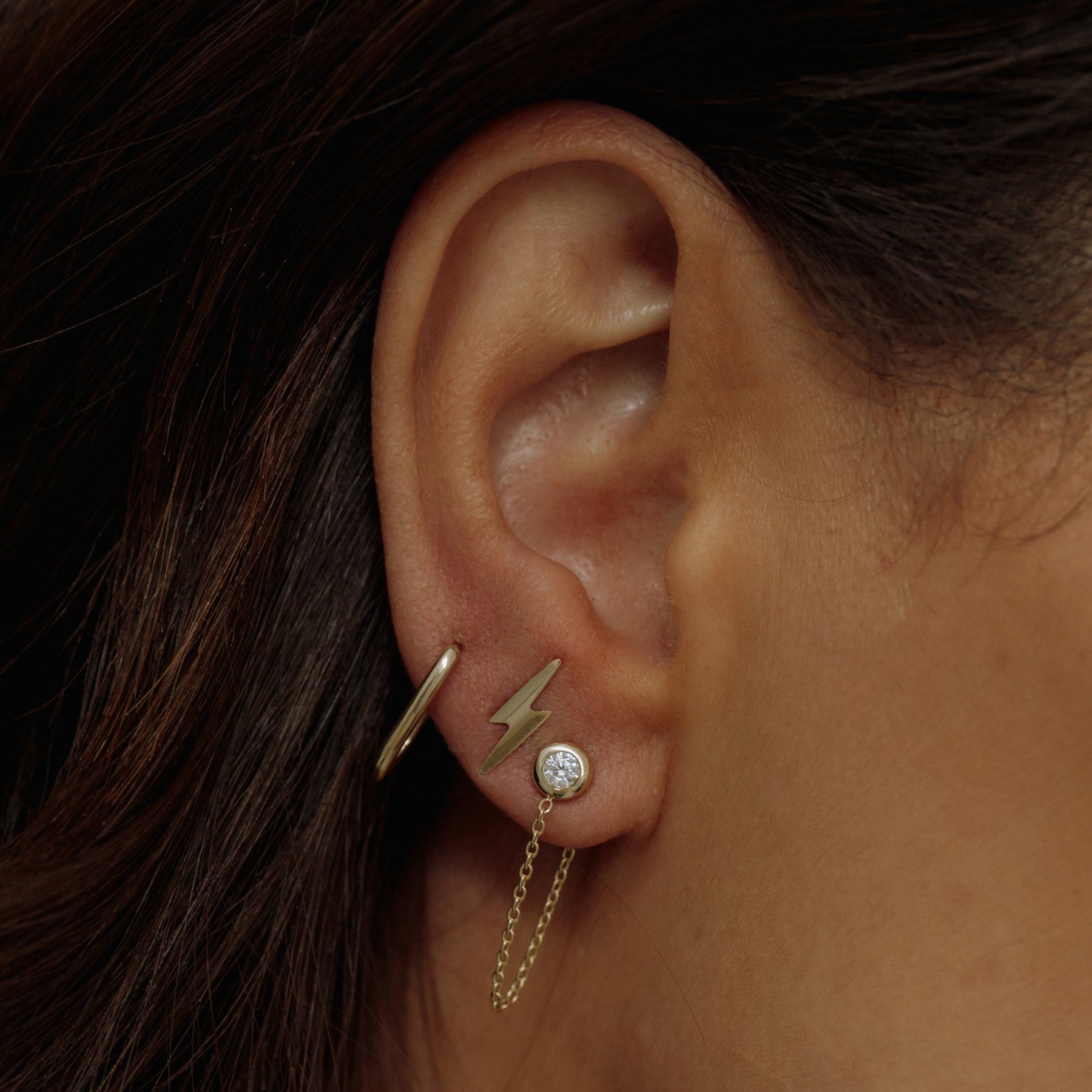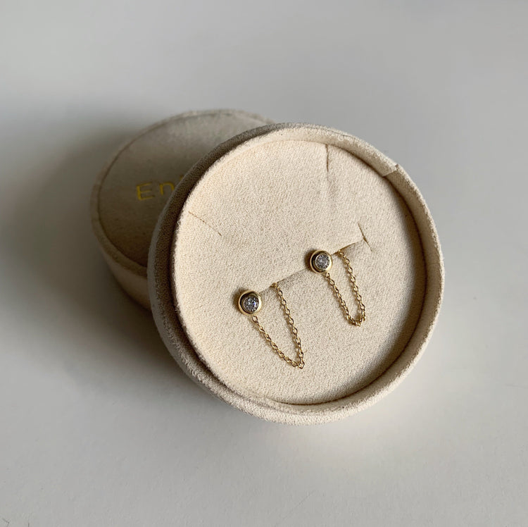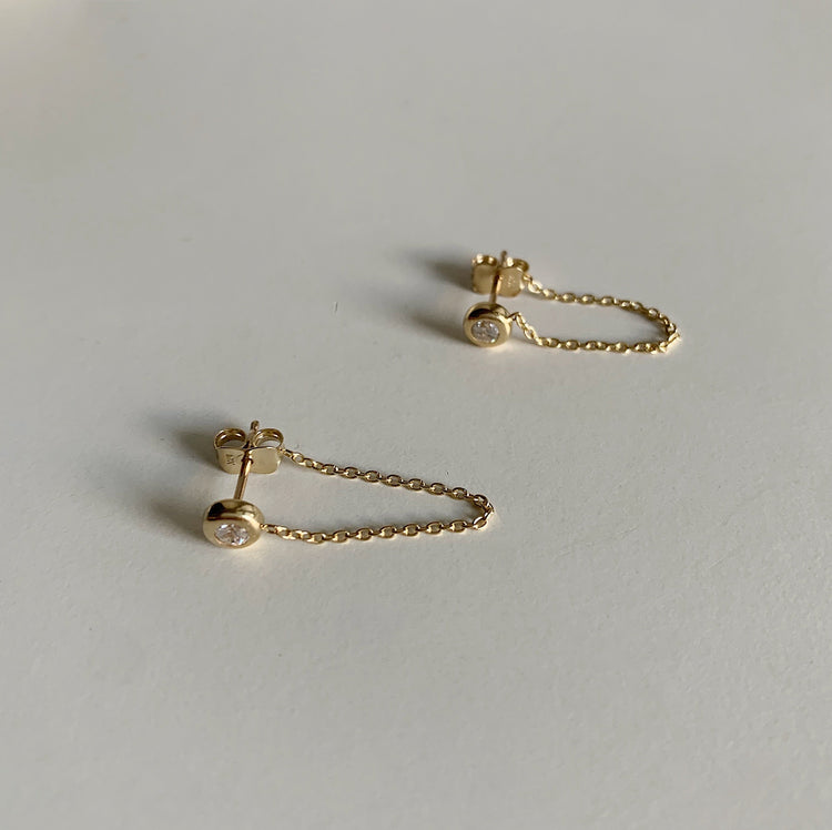 10k gold perfection - a stud with an attached chain that loops back to the earring backing. Just put on the backing, or use that backing on your next hole for an alternative way to wear these.