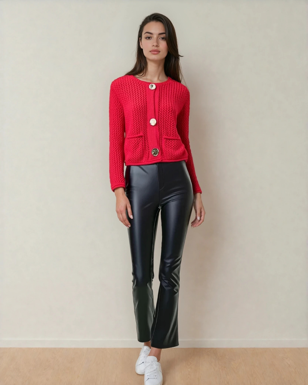 The Elsie Cardigan in Scarlett red exemplifies refined style with its striking silhouette and distinctive design details. Crafted with intention, this piece features substantial gold hammered buttons that serve as elegant focal points, elevating the overall aesthetic. The rich scarlett tone provides a timeless foundation for versatile styling, whether layered over evening wear or paired with tailored separates.