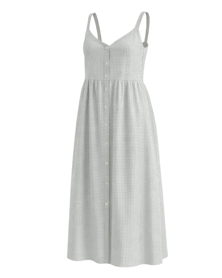 Fresh, feminine, and classic, the Estelle Dress features a cotton fabric construction with a button-down front for timeless charm. The baby blue and white check pattern adds a soft, playful touch, making it perfect for brunches, picnics, or casual daytime occasions.