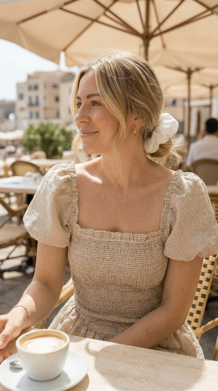 The square neckline and romantic puff sleeves add vintage-inspired charm, while the gently flared skirt creates a balanced, flattering silhouette. Crafted in a lightweight neutral micro-check woven fabric, this dress transitions seamlessly from daytime outings to evening plans.