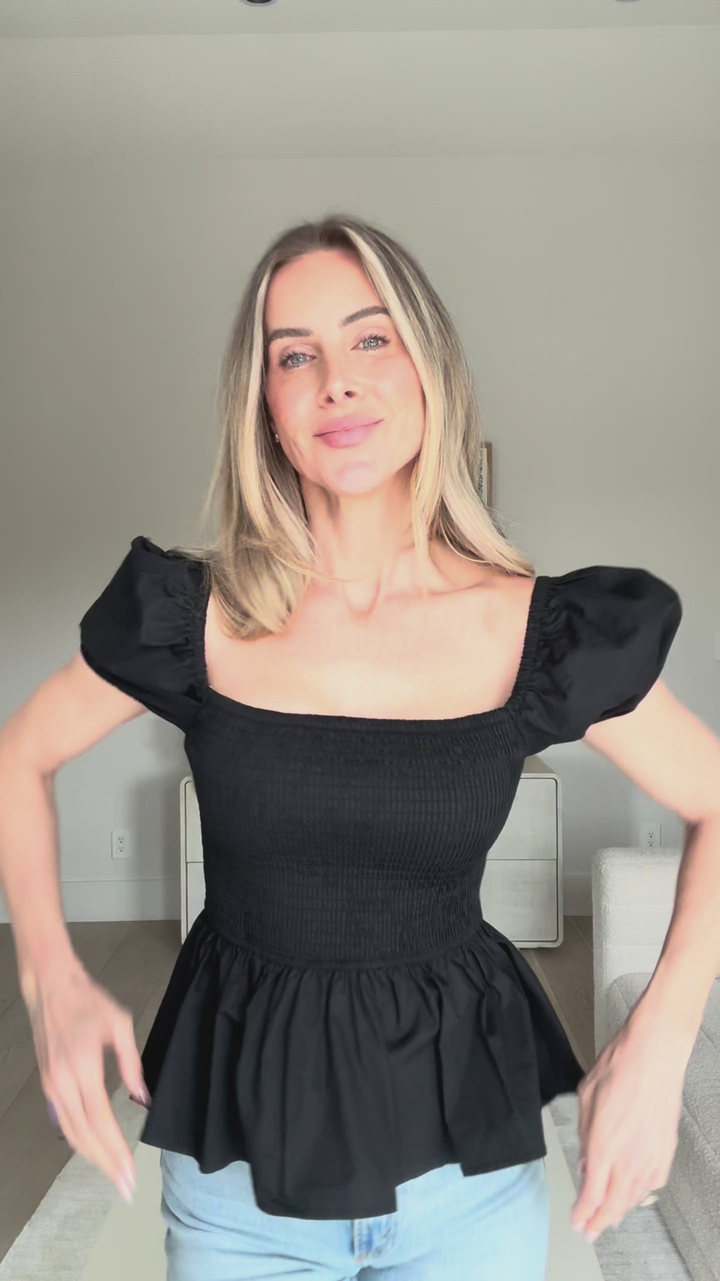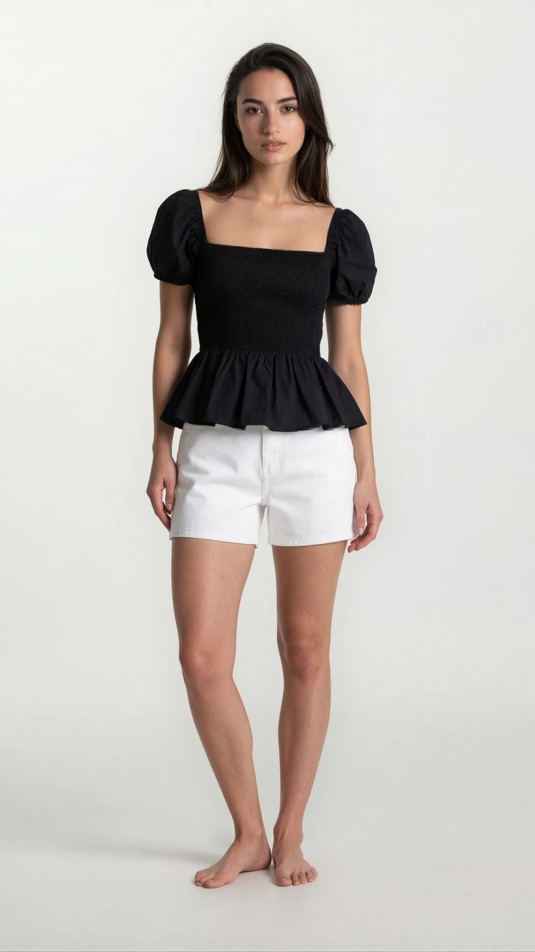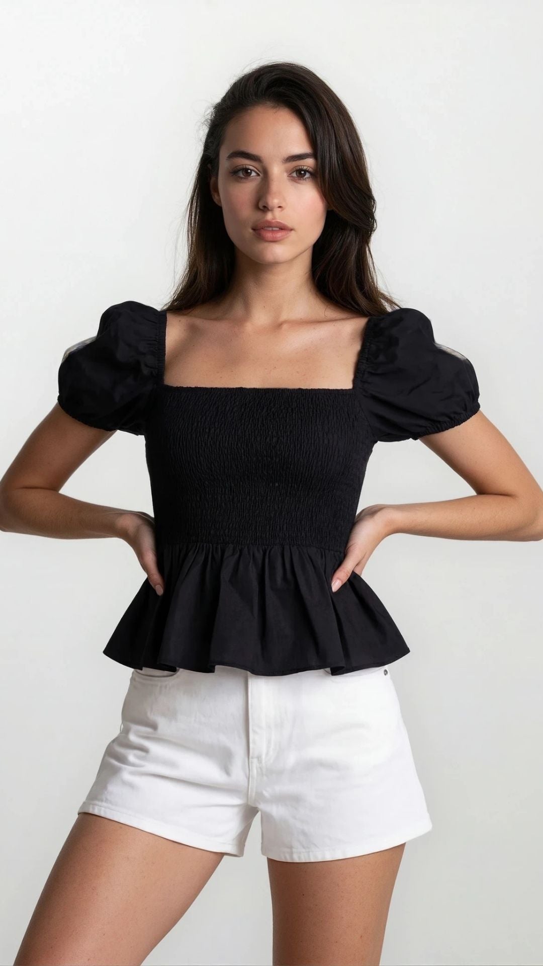 Sera – Cotton Poplin Puff Sleeve Peplum Blouse Top In Black