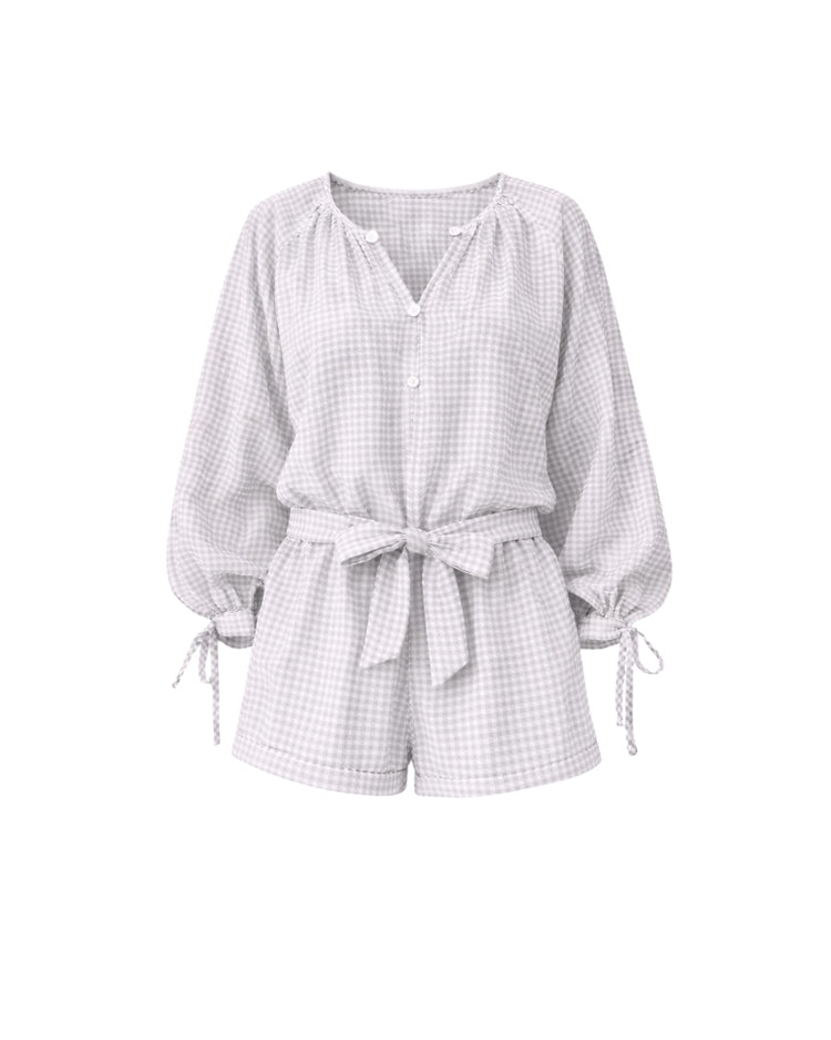 Playful and polished, the Tawny Romper is designed for easy, versatile style. Crafted in lightweight gingham cotton, it features long sleeves, a relaxed fit, and an optional tie to cinch the waist for a flattering silhouette. The baby blue and white check adds a soft, charming touch—perfect for casual outings, brunch, or weekend adventures.