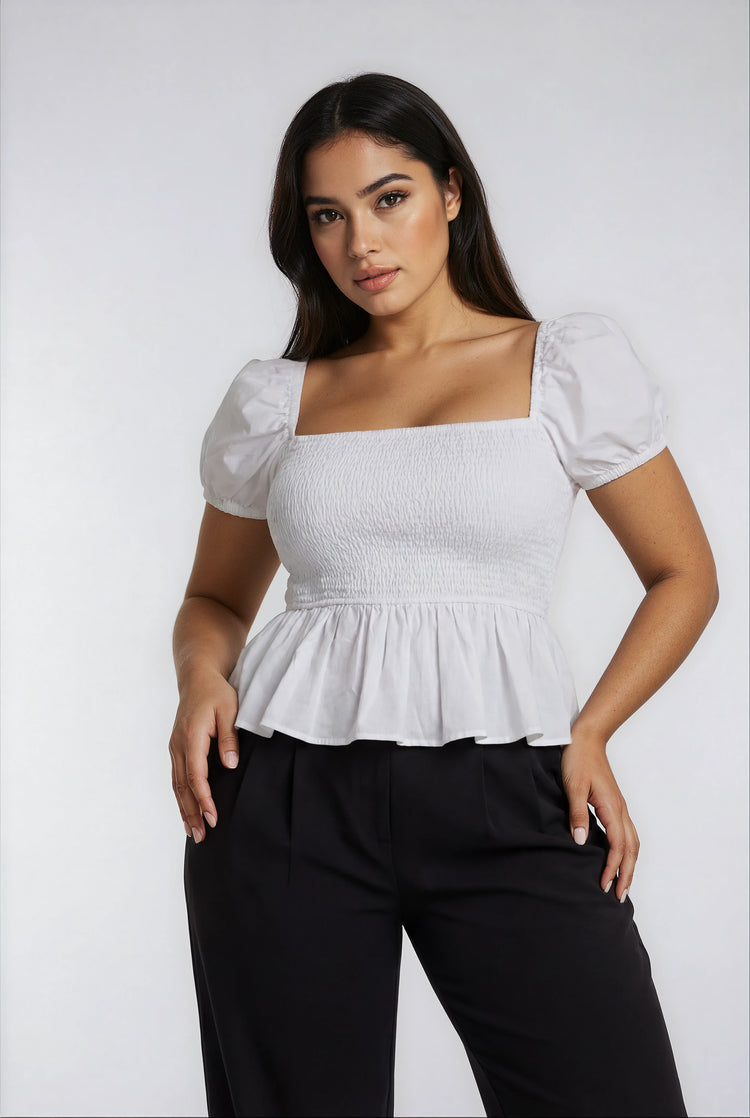Sera Peplum Blouse – Cotton Poplin Puff Sleeve Top white